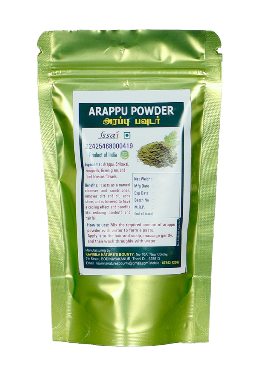 Mix the required amount of arappu powder with water to form a paste. Apply it to the hair and scalp, massage gently and then wash throughly with water.